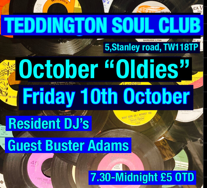 Teddington Soul Club’s annual October “Oldies” night will be on Friday 10 OCTOBER when we will welcome our guest DJ on the night: Buster Adams. Join us for a night of 60s and 70s Northern Soul classics!