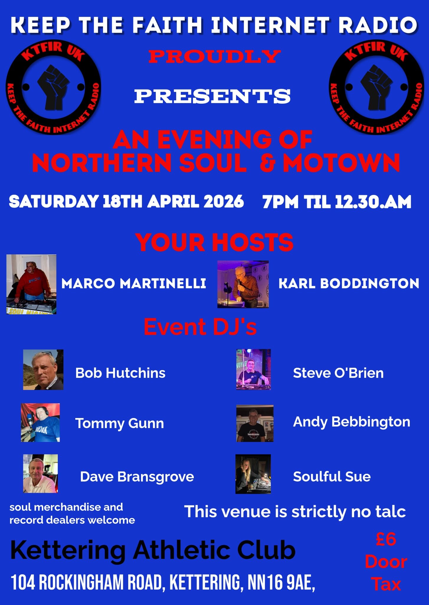 Keep the Faith Internet Radio proudly presents a night of classic Northern Soul and Motown featuring some of the stations Northern Soul DJs, Bob Hutchins, Steve OBrien, Tommy Gunn, Andy Bebbington, Dave Bransgrove and Soulful Sue