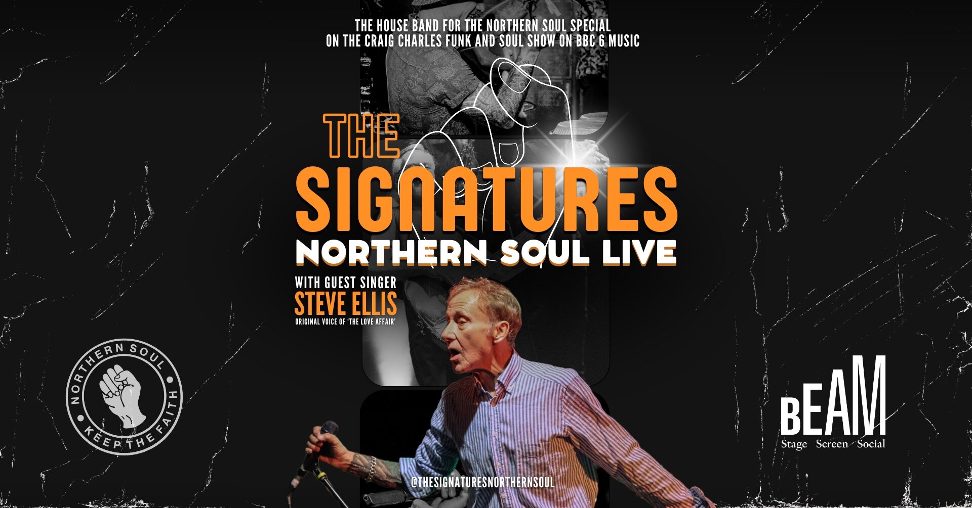 The UK’s most authentic Northern Soul Live Show! Experience the soul-stirring magic of The Signatures—the official backing band for many of the Northern Soul original artists as well as being featured as the house band for the Northern Soul special on The Craig Charles Funk and Soul Show on BBC 6 Music.