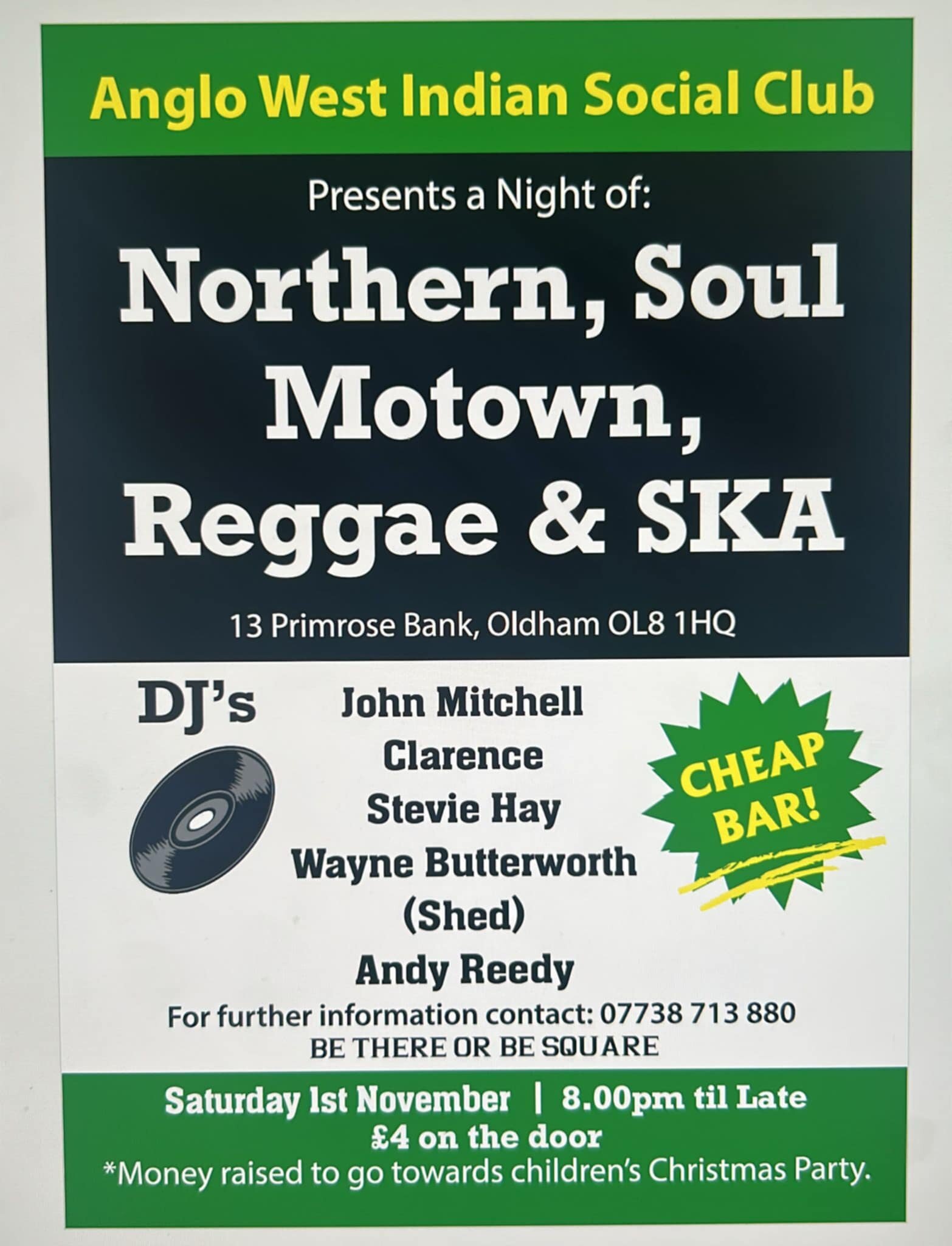 Welcome to another night of right across the board soul music on vinyl ,raising monies for the Christmas party for local children ( last years a huge success) ,djs on the night performing for your delight are ,John Mitchell, Clarence, Stevie Hay, Wayne SHED Butterworth & Andy Reedy, all monies as stated goes towards a kiddies Christmas party so all the djs are volunteering to play the records for free and any enquiries please phone Val Mears on 07738713880 see you on the night all details on the flyer