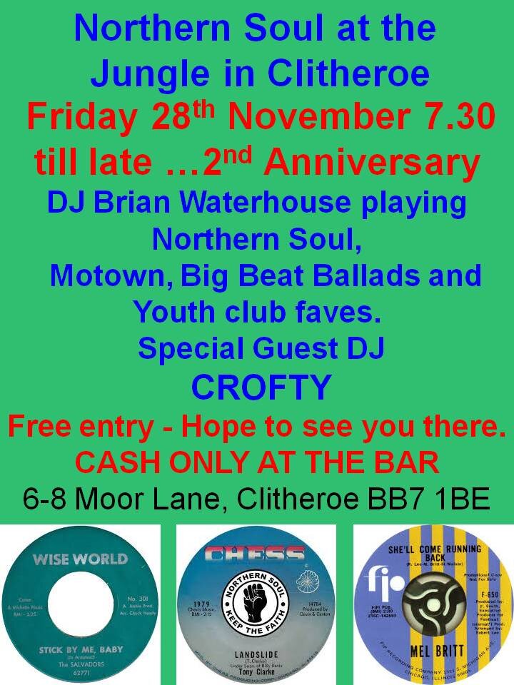 Northern Soul, Motown, and soul ....The Jungle in Clitheroe. This is our 2nd Anniversary of a small gathering of friendly people. Join us for great sounds among like minded people. Details in the flyer - CASH only at the bar...hope to see you there for what should be a great night.
