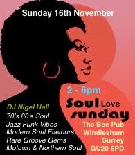 Sunday afternoon vibes - 70s / 80s Soul, Jazz Funk, Motown and more. Classy tunes on Vinyl (and CD) played by DJ Nigel Hall in a nice Village pub. Plenty of free parking. Pub food available (see web site).