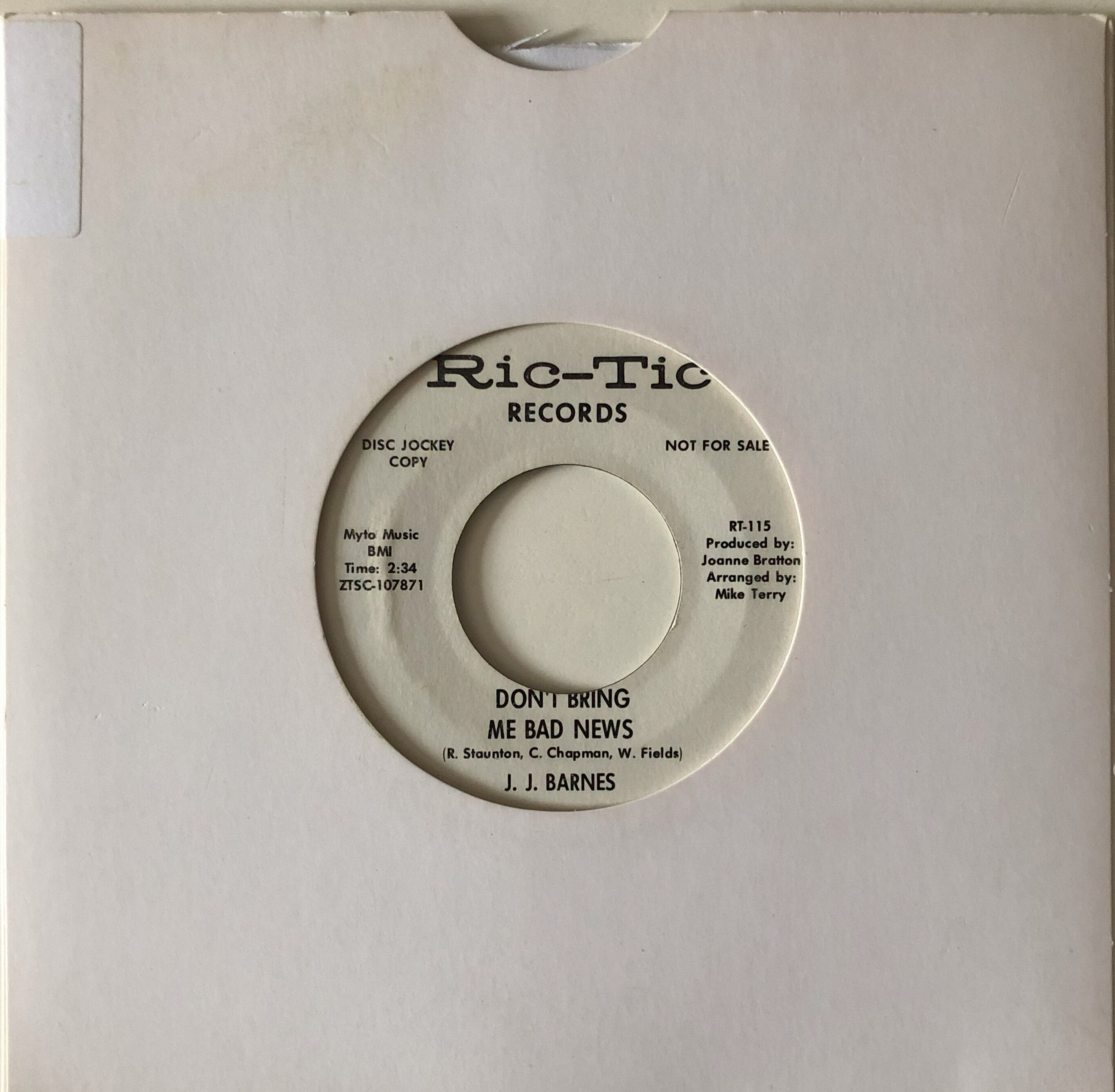 2 J J Barnes – Don’t Bring Me Bad News – Ric-Tic 115 WDJ M- £30 long under rated drivin’ mid-tempo dancer arranged by Mike Terry, tough on a demo
