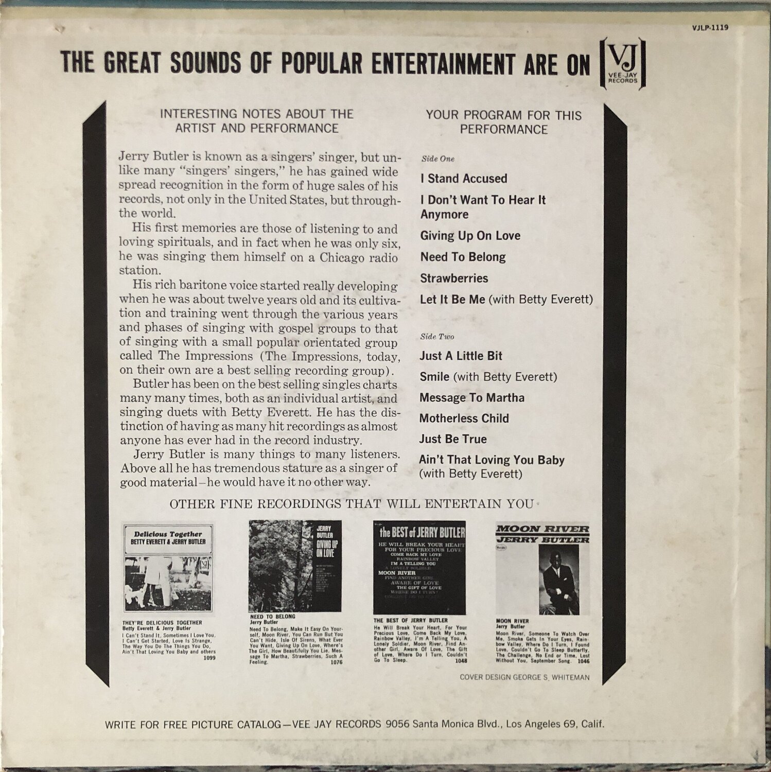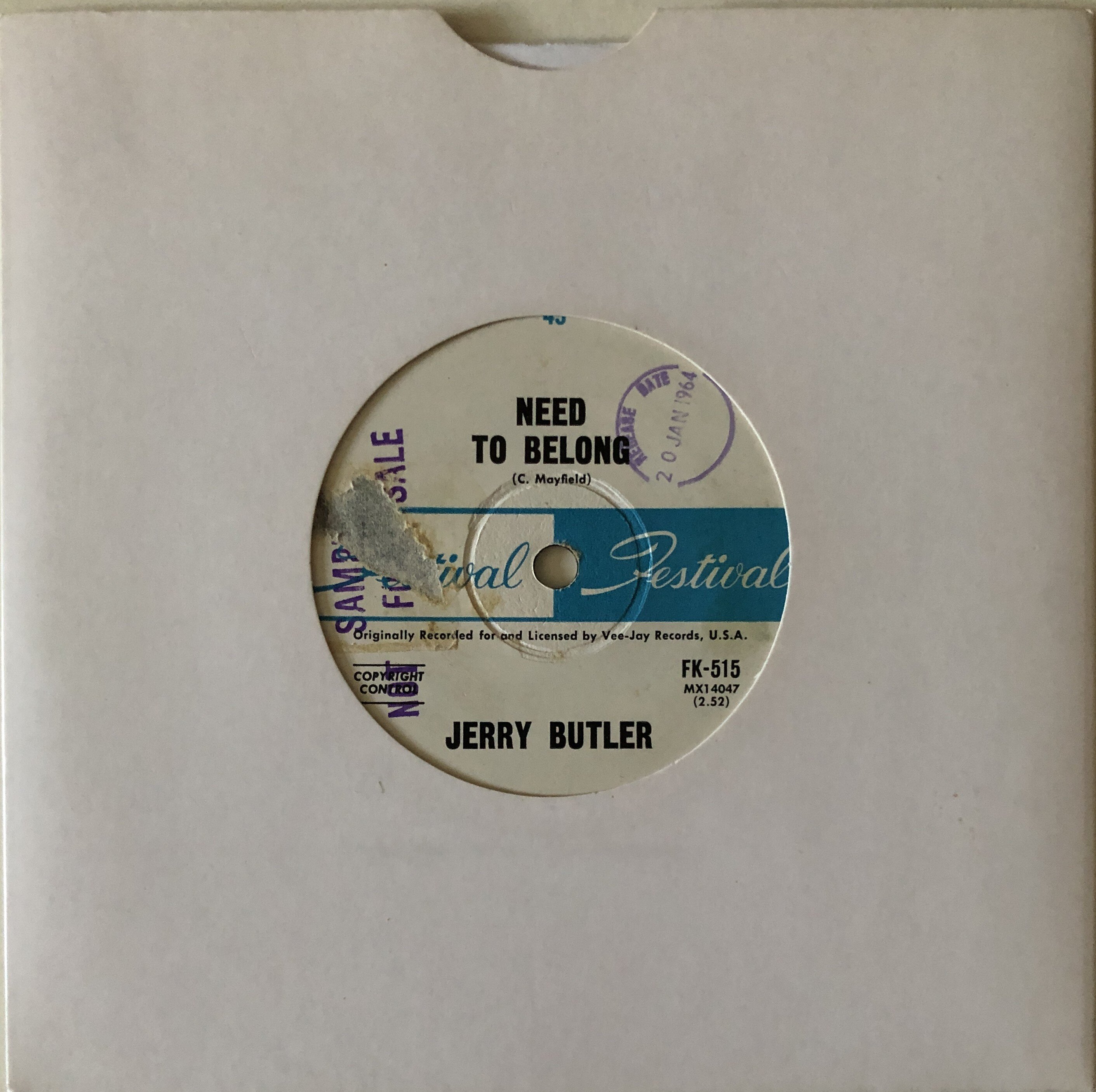 Payment by PayPal as F & F or add 5% to cover fees Paypal to roger-banks@supanet.com or Bank Transfer please PM if interested UK Customers Only New Postage Rates 1st Class £4.50 add £0.75 for each additional item, Recorded Delivery add £2.00 to 1st class rate, Special Delivery £10.00 to 1st class rate Please note company sleeves shown are not included with each record, unless stated, but are available at an extra cost from £2.00 each please ask for prices All in excellent condition & strictly & individually graded 1 Jerry Butler – Lost – Canadian Reo 8342X M- £20 an early US Abner recording on a lovely label format, mint vinyl copy of this superb mid-pace / mid-tempo grower 2 Jerry Butler – I Found A Love b/w Lonely Soldier – Canadian Reo 8485X M- £20 another stunning label & condition copy, two great early sides 3 Jerry Butler – Find Another Girl – Vee Jay 375 M- £15 vinyl issue of this lovely mid-tempo side 4 Jerry Butler – I’m A Telling You – Vee Jay 390 M- £15 another great early mid-tempo dancer, mint vinyl copy 5 Jerry Butler – You Go Right Through Me b/w Theme From Taras Bulba – Vee Jay Picture Promo Copy 475 M- £20 unusual item, film score backed by a great jazzy mid-tempo mover, recommended 6 Jerry Butler – Just A Little Bit b/w A Woman With Soul – Vee Jay 556 M- £20 double sided R & B mover, side A same as Tiny Topsy, a mint vinyl copy 7 Jerry Butler – Need To Belong b/w Give Me Your Love – Vee Jay 567 M- £15 fabulous pleading mid-pace double sider Plus Australian Festival Radio Station Demo Ex / M- £20 label tear on one side only, release date stamped mint vinyl copy, a lovely item at a nice price 8 Jerry Butler – Good Times – Vee Jay 651 Demo M- £15 two X’s on label only vinyl mint, mid-pace uplifting grower 9 Jerry Butler – I Can’t Stand To See You Cry – Vee Jay 696 M- £15 awesome big ballad grower, Van McCoy penned vinyl issue 10 Jerry Butler – Just For You b/w Believe In Me – Canadian Vee Jay VJ707 Demo M- £20 upbeat mover & pleading mid-pace flip on a nice vinyl copy Plus US Vee Jay vinyl Issue M- £15 11 Walter Jackson – It’s All Over b/w Lee Cross – Okeh M- £15 pleading mid-pace ballad & upbeat mover on flip 12 Walter Jackson – One Heart Lonely – Okeh M- £25 superb big production mid-tempo grower 13 Lou Johnson – It Ain’t No Use b/w This Night – Hill Top 5541 M- £15 mid-pace pleading ballad, mint copy 14 Lou Johnson – Please Stop The Wedding – Big Hill Demo M- £20 rare demo & a great mid-pace ballad 15 Lou Johnson – What Am I Crying For b/w Anytime – Big Top Demo M- £20 vinyl demo,& another superb mid-pace ballad grower, Hill Top, Big Hill & Big Top are one & the same company 16 Lou Johnson – Reach Out For Me b/w Magic Potion – Big Top – M- £25 double sided mid-tempo perfection, mint vinyl copy 17 Lenny O’Henry – Sweet Young Love – Atco WDJ M- £25 vinyl demo of this big voiced mid-tempo mover from 1964 18 Lenny O’Henry – Across The Street – Atco M- £20 Bob Crewe & Charlie Callelo unite on this latinesque flavoured 1963 mid-tempo dancer, viny copy