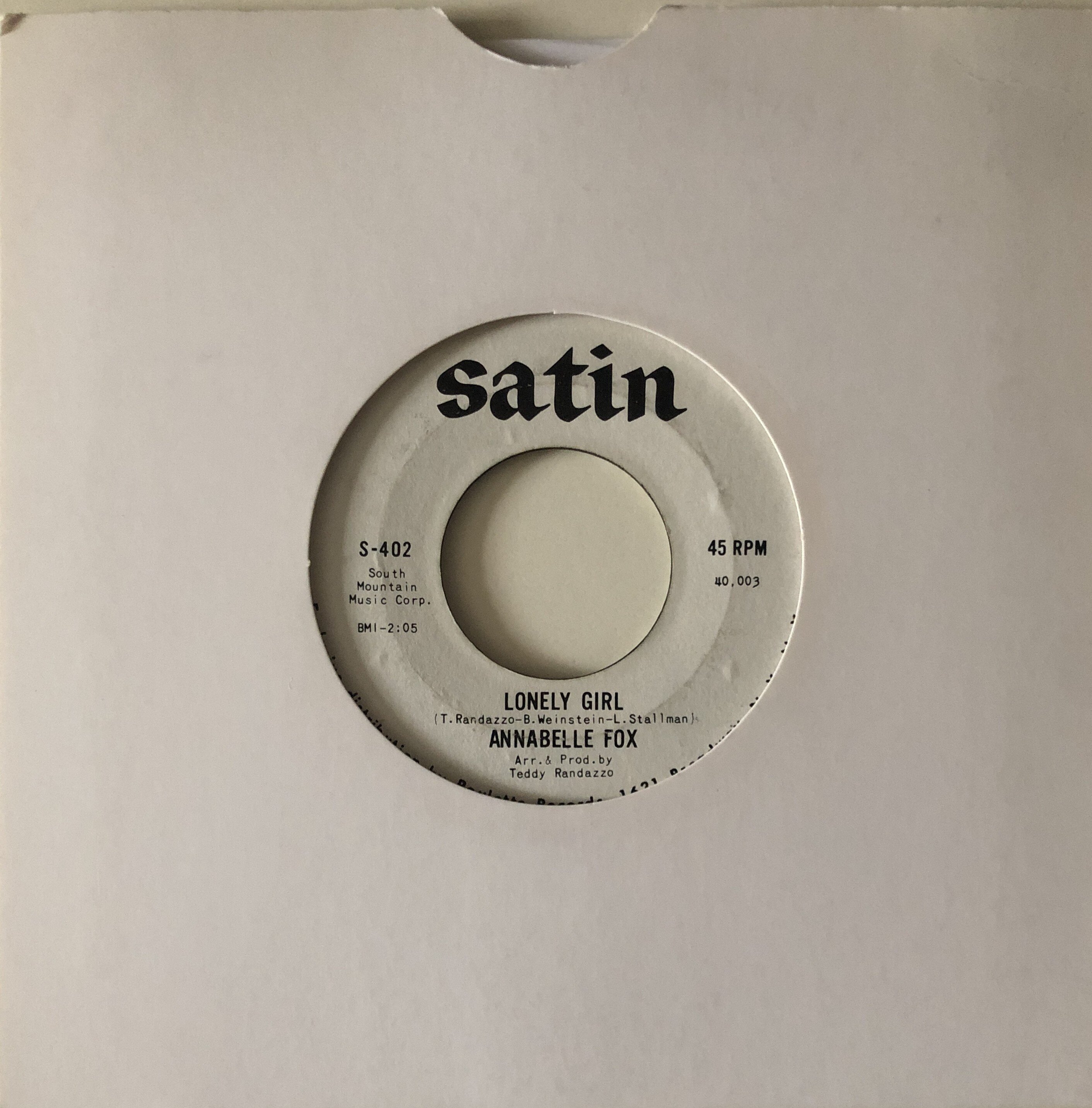 Payment through PayPal as F & F or add 5% to cover fees Paypal to roger-banks@supanet.com Please PM if interested UK Customers Only New Postage Rates 1st Class £4.50 add £0.50 for each additional item, Recorded Delivery add £2.00 to 1st class rate, Special Delivery £11.50 Please note company sleeves shown are not included with each record but are available at an extra cost from £2.00 each please ask for prices All originals & strictly & individually graded 1 Annabelle Fox – Lonely Girl b/w Humour Me – Satin S402 WDJ M- £450 a lovely copy of this atmospheric mid-tempo big city soul femme fatale girlie grower co-penned & produced by the great Teddy Randazzo, no hiss on intro or cue burn on run in like most as this is a styrene record & a mint flawless copy - SOLD 2 Robin Rice – I’ve Had It b/w Wanted – Metro International Productions M- £175 stunning 1st label copy before Crackerjack for this awesome double sider, ex Radio Station copy with stickers on both sides vinyl mint, dramatic big city soul mid-tempo grower, same as George Smith on Turntable & flip is an awesome pleading mid-pace version of Larose Phillips on Gold Disc, not often listed on this label & in this condition